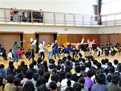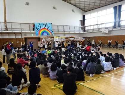 最後にはみんなで作った大きな虹のありがとうの文字の幕が降ろされて、3年生の元気いっぱいの声が響きました。