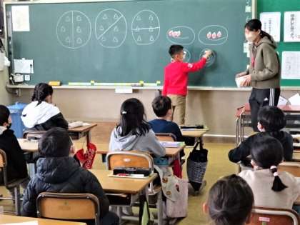 2年生は算数で「半分に分ける」学習に入りました。「半分に分ける」とは、実際にどうすることでしょうか。実際に黒板でやってみて、みんなで考えました。