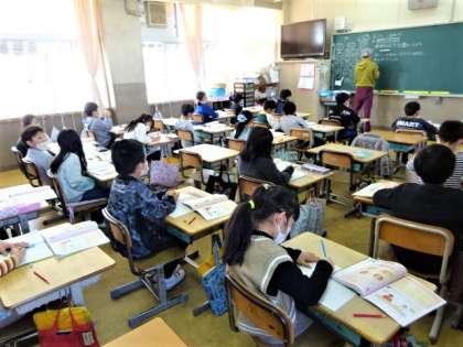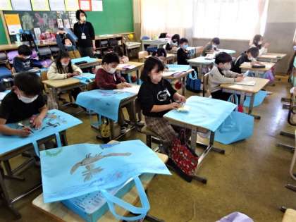 算数や国語の課題を終えて、図工の作品を入れるバッグに絵を描いているクラスもありました。