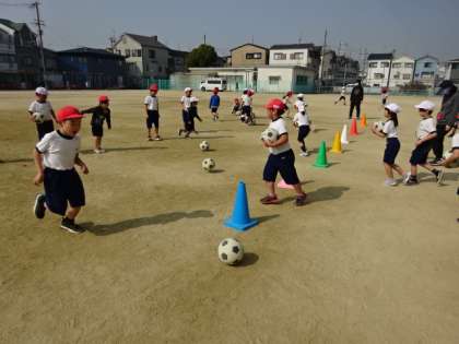 ボール運動ではポールめがけてボールを蹴って、ポールに当たったら1点で、班ごとに何点取れるか頑張っていました。