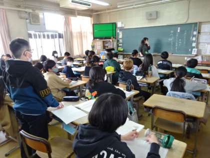 国語の「大造じいさんとガン」のお話の最後のところについて話しています。ひと冬看病して元気になったガンの残雪を空に返してやる時に、「じいさんは、おりのふたをいっぱいに開けてやりました。」と書かれているが、「いっぱいに」という言葉があるのとないのではどのように違いがあるかという先生の質問に、みんなで考えています。
