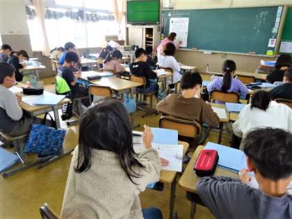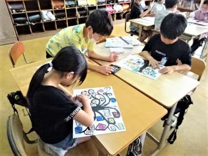 4年生は図工で黒の線で描いた木に灯りがともるように、クレパスで色を塗ったところを指でこすって、淡い色に仕上げています。