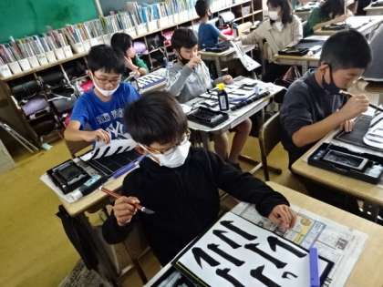 書写の学習では、毛筆で「はね」の仕方を練習しました。