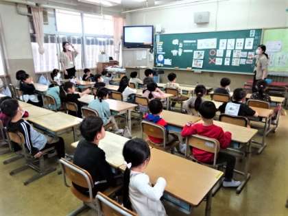 あらかじめ給食を担当される栄養教諭の先生が1年生に学校給食のことをお話してくださいました。
