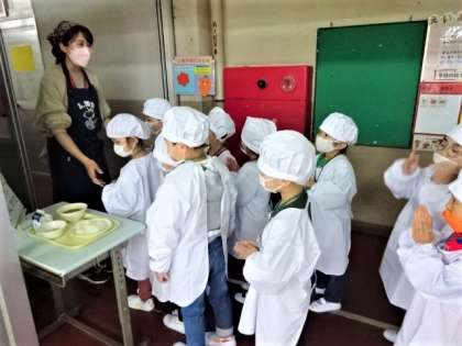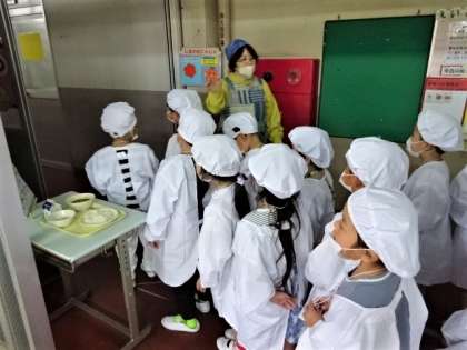 給食当番は真っ白なエプロンを着て、先生と一緒に給食室に向かいます。