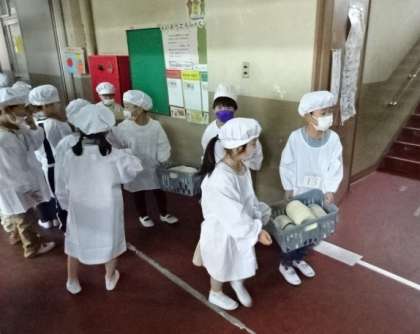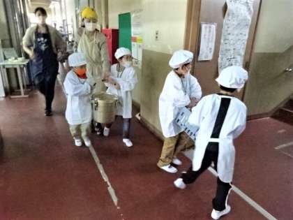 給食当番の子どもたちは、重い食器や牛乳、食缶もお友だちと力を合わせて、教室まで運びました。
