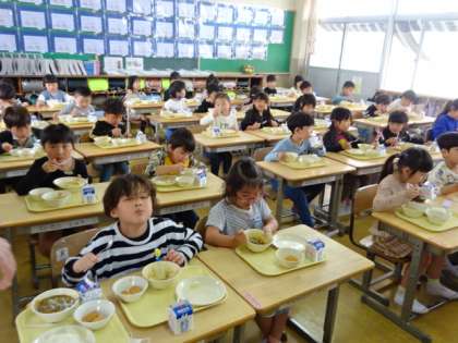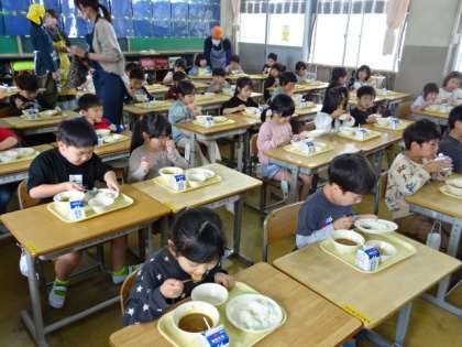 美味しそうに給食を食べる1年生。残さずにとてもきれいに食べていました。親指で「グッドサイン」を隣の友だちに見せている子もいました。