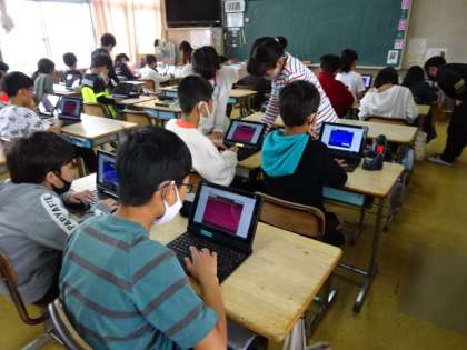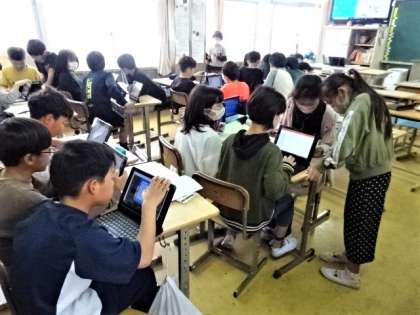 今日は雨で運動場が使えなかったので、タブレットパソコンの練習をしています。
