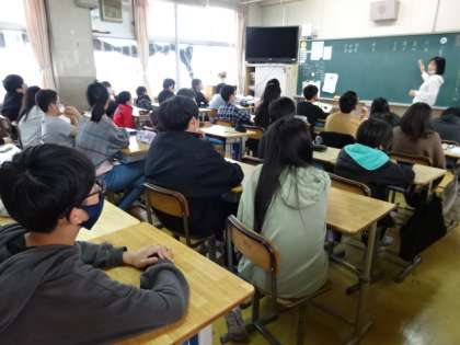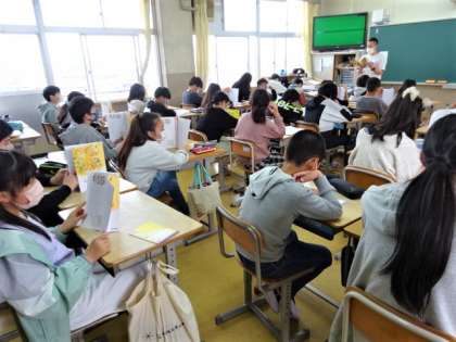 道徳では「心を形に」というテーマで、先生がまず教科書の本文を読み聞かせています。
