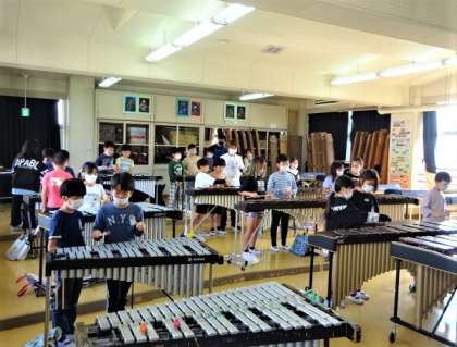 4年生は音楽でペアになって、木琴や鉄琴の練習をしています。友だちの演奏をサポートするのも大事な学習です。