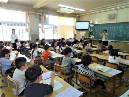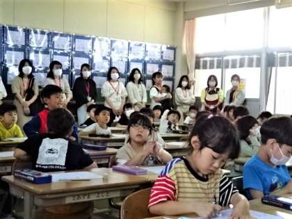「て」のつく言葉を子どもたちに尋ねると、次々にたくさんの言葉が発表されました。先生が「てぶくろ」や「てがみ」を用意しておられました。また、手拍子を打ちながら、「て」のつく言葉をみんなで言ってみました。
