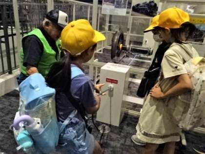 電車の車輪と綱引きをしたり、運転台に座って運転手になった気持ちになったりすることができます。