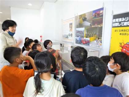 見学の最後のコーナーでは、リチウム電池など充電式の電池やそれを使った電気製品をごみとして出してしまうと、ごみピットの中で火災が発生し、大変なことになってしまうお話がありました。子どもたちもよく聞いていました。