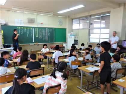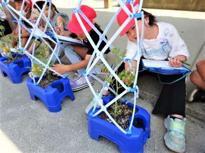 生活科では育てているミニトマトに緑のかわいい実がつき始めました。じっくり観察してカードに気付いたことを記入しています。