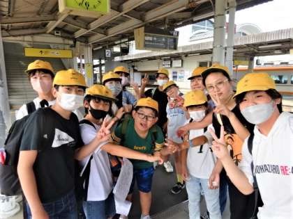 近鉄「新祝園」駅では、なんとホームにクワガタがいて、みんなで一緒に記念撮影しました。