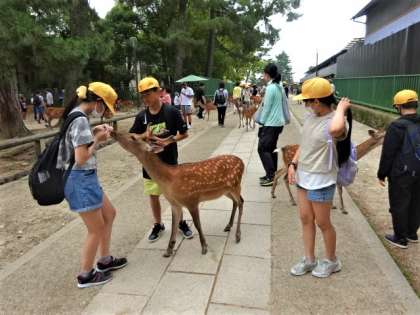 早速、奈良公園の鹿たちが子どもたちを出迎えてくれました。(鹿せんべいを「ちょうだい」と言っているようです。)