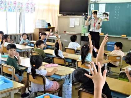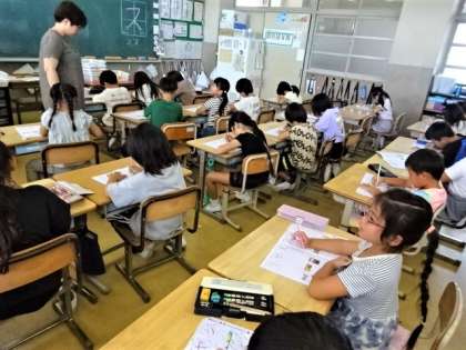 1年生は国語の学習でカタカナの「ス」を習っています。言葉でも文字の特徴を唱えながら、丁寧に書いていました。