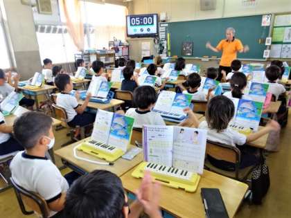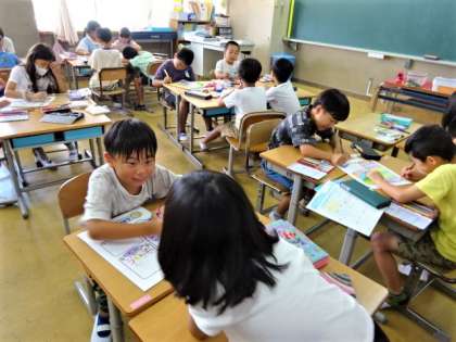 2年生は新しくなった係活動のカードを友だちと一緒に書いています。