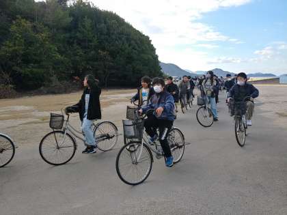午前中、1つめの活動のサイクルラリーが始まりました。サイクリングをしながら島に残されている遺構を回ります。瀬戸内海の自然も味わいながらのサイクリングです。