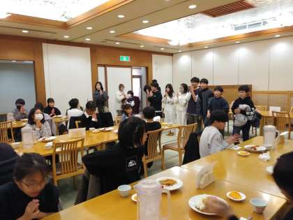 お昼ごはんはカツカレーを食べました。退村式では楽しい思い出を作っていただいた休暇村のスタッフの方にみんなでお礼を言いました。