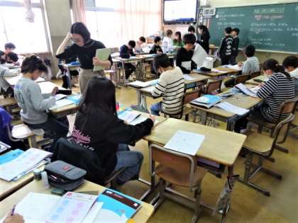 5年生は算数の時間に、円周率を使って解く問題に挑戦していました。問題が1問解けたら、先生に見てもらっています。