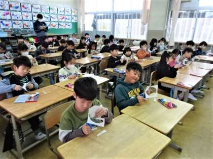 1年生は6年生に卒業のお祝いで贈るメダルを作っています。6年生を送る会で1年生からプレゼントする予定です。