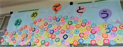 1年生の教室前の廊下には、卒業記念で体育館に掲示予定の「おめでとう」の文字が掲げられています。お花は子どもたちが作りました。