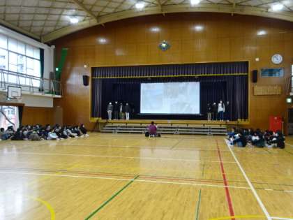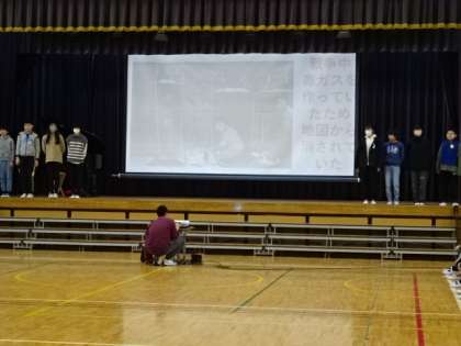 6年生は平和学習で学んだことを発表する練習をしています。それぞれのグループで一人ずつ呼びかけていきます。