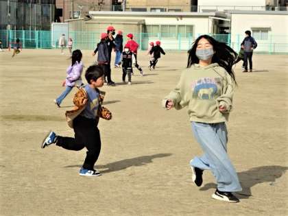 はじめは「しっぽとり鬼」です。前半は赤組が鬼になって白組の子どもたちのしっぽを取りに行きました。