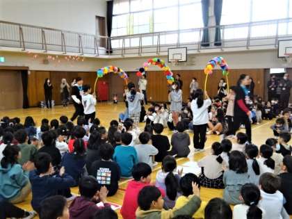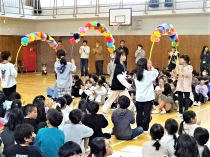 花道のアーチは児童会の子どもたちが委員会活動の時に一生懸命に作りました。みんなの大きな拍手に迎えられて、6年生が正面のひな壇に並んでいきます。