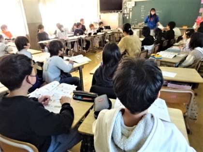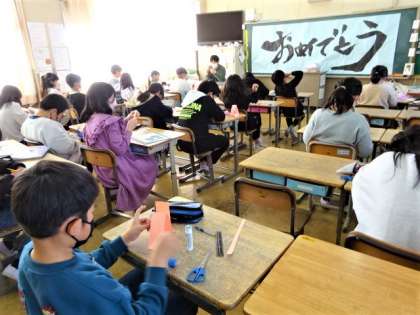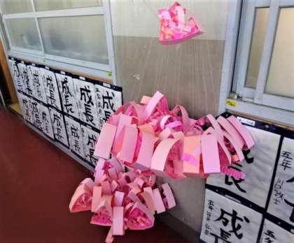 5年生は図工で素敵なオブジェ(立体作品)を作っています。このオブジェを使って、卒業式場の体育館の5年生による「おめでとう」の掲示物にするようです。
