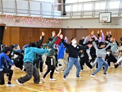6年生が練習を終えて、教室に戻ろうとした時、「ちょっと待ってください!」と5年生のサプライズの演技が始まりました。