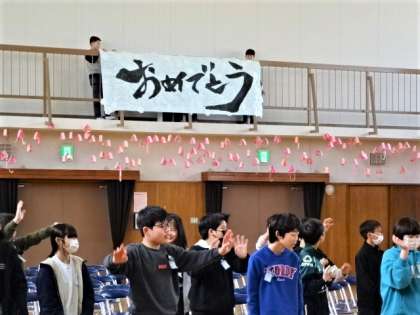 5年生の子どもたちの6年生への感謝の呼びかけの最後に、子どもたちが作った「おめでとう」の垂れ幕が下りました。