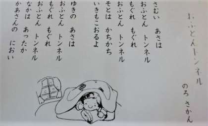 今日は「おふとんトンネル」という題名の詩を読みました。児童文学者の野呂昶(のろ さかん)さんの詩で、子どもたちが大好きなおふとんの中でぬくぬくする温かい詩です。
