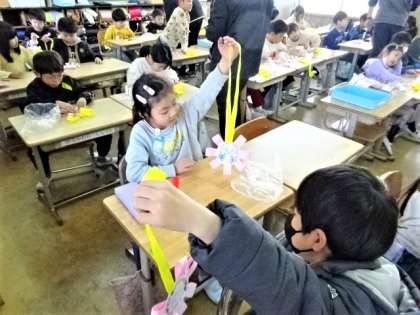 1年生はもうすぐ2年生になるので、今度入学してくる新1年生に送るメダルを作っています。みんなお兄さん、お姉さんになっていきます。