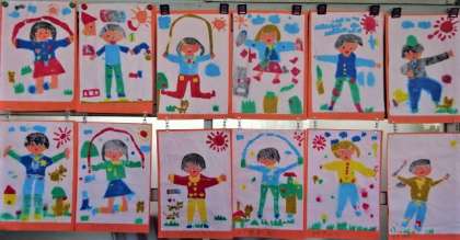 廊下には図工の最後の作品が展示されています。一人一人、なわとびをしたり元気な様子です。