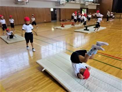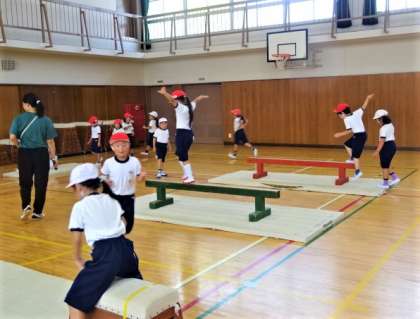 1年生の体育の学習の様子です。体育館ではいろいろな種目の運動を組み合わせて、サーキット形式で取り組んでいます。みんなとても楽しそうです。