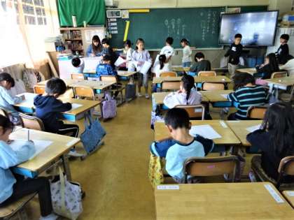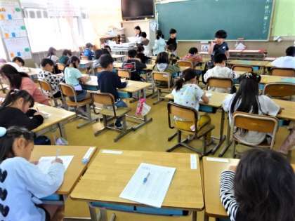 1年生は算数でひき算の計算練習をがんばっています。プリントの計算問題の1列が終わると先生に〇をつけてもらい、1枚プリントが仕上がると次の問題プリントに挑戦します。子どもたちの計算がどんどん速くなっていき、サクランボの計算のしかたを使わなくても答えを出せるようになりました。最高で新たなプリントが8枚までできるようになりました。