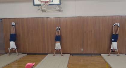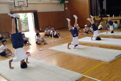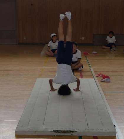 5年生は、体育のマット運動で倒立に取り組んでいました。