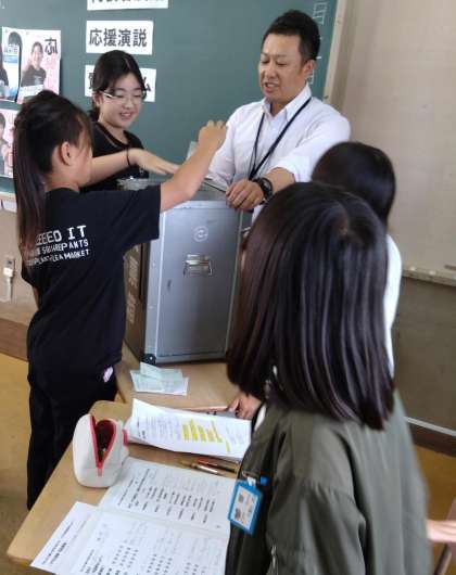 本物の投票用紙と投票箱に子どもたちも興味津々です。