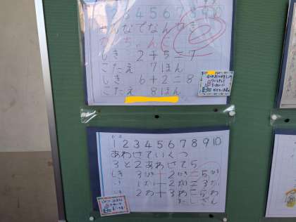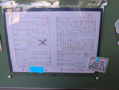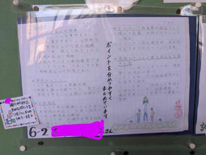 職員室の前の廊下には、各クラスのお手本となるすてきなノートを掲示しています。