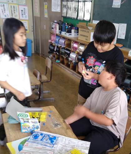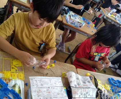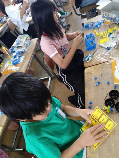 説明書を見て、先生の話を聞いて、部品を切り取って組み立てます。