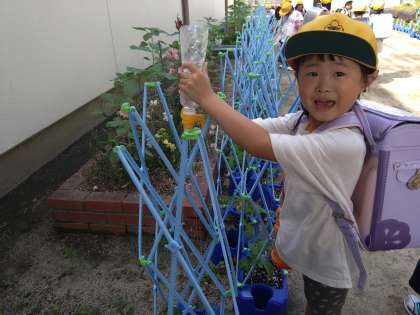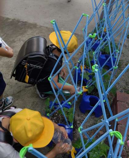 1年生の育てているあさがおが、ぐんぐん育っています。