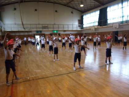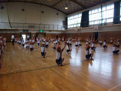 5時間目、4年生が体育館で運動会のマスゲーム「エイサー」の練習をしていました。