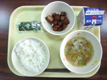 今日のメニューは、キャベツのスープ、まぐろのケチャップあえ、ご飯、海苔、牛乳でした。