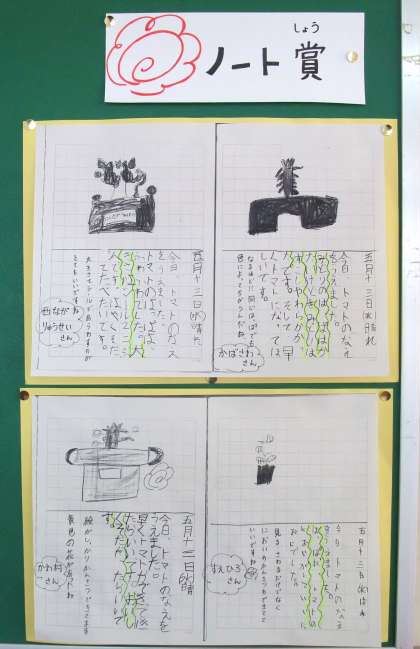 児童の様子を見て回っていたところ、2年生の掲示板に「ノート賞」が掲示されていました。