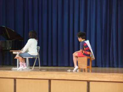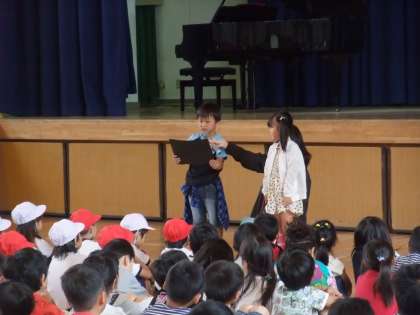 今月の生活目標の発表に、1年生が登場しました。今月の目標は、「友だちと仲良く遊ぼう」です。