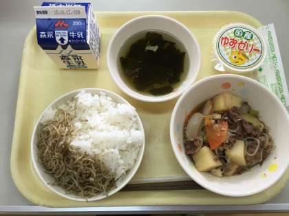 今日のメニューは、ごはん・すきやき煮・すまし汁・じゃこのいりに・ゆずゼリー・牛乳でした。
