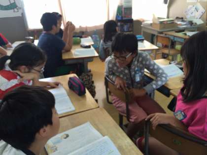 グループで登場人物の気持ちを考えています。