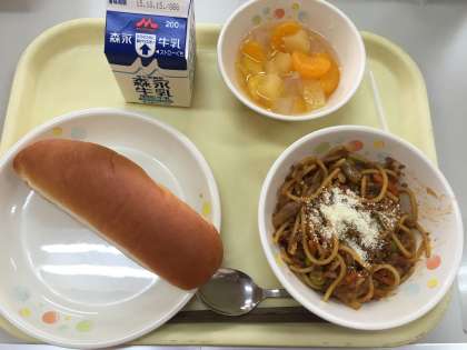 今日のメニューは、ベビーパン・スパゲティミートソース・フルーツ寒天・粉チーズ・牛乳でした。